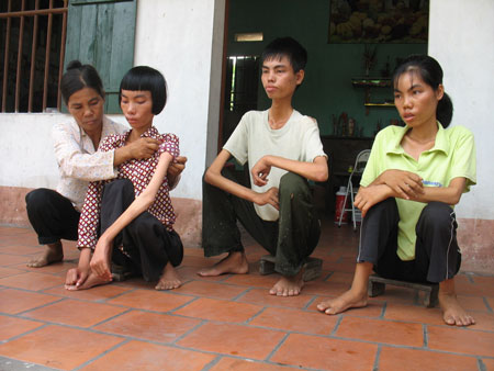 Cứ nuôi lơn lớn, học hành giỏi giang, th́ chúng nó mới lăn ra… teo tóp toàn thân. Đau lắm chú ạ”, bà H́u khóc. Đến năm 2001, teo hết cơ thịt trên toàn thân, nắm xương ẻo lả của bé Việt đổ xuống vĩnh viễn. Giờ đây, trên ban thờ, bức ảnh ḷe nḥe hiếm hoi c̣n sót lại của Vũ Thị Việt cứ ngơ ngác nh́n đời, bên cạnh là di ảnh ông bố đau khổ Vũ Văn Kỳ, đang dịp Tết Tân Măo, mỗi bát nhang được gài một tờ hai ngh́n đồng. Ngoài sân, lần lượt các bệnh nhân teo cơ toàn thân ngồi trù trụ như những cây… bụt mọc, gồm: Vũ Thị Huệ, 34 tuổi; Vũ Thị Hồng, 32 tuổi; Vũ Văn Hào, 27 tuổi. Ba em như ba cục da bọc xương, thoáng trông chỉ thấy cái đầu, chân tay bùng nhùng trong ống tay áo, ống chân quần. Hơn 10 năm qua, bà H́u phải cơm bưng, nước rót, vệ sinh tắm rửa, mũi dăi, thậm chí, đặn, mỗi khi các cô gái “thấy tháng”, bà cũng phải… làm thay các con gái “từ đầu đến cuối”. Đấy là chưa kể đói nghèo triền miên.