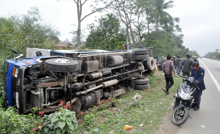 Tránh xe cùng chiều, một xe tải lật bên lề đường