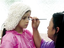 Bà mẹ đang trang điểm cho con gái trước giờ biểu diễn.