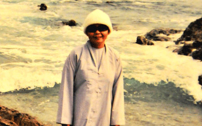 Sư cô Liên Thi trong một buổi dạo chơi ngoài biển trước khi mất tích. Cụ bà thân mẫu của sư cô từ Việt Nam qua Mỹ rước xác con tới nay vẫn chưa làm được việc này v́ sở Sheriff sau 5 tháng vẫn chưa xác định danh tánh tử thi. (H́nh: Hà Giang/Người Việt, chụp lại từ album của sư cô Liên Thi)