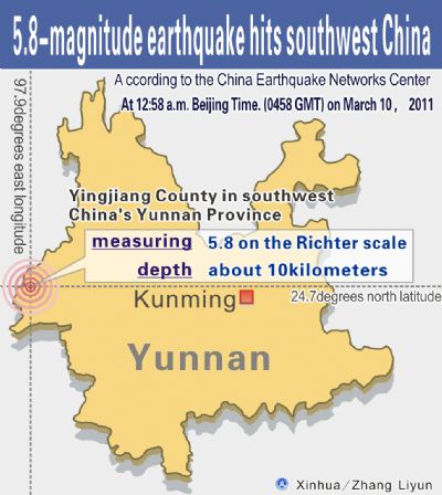 Trận động đất xảy ra vào 12h58 chiều nay (giờ Bắc Kinh), ở huyện Doanh Giang, cách thủ phủ Côn Minh của tỉnh Vân Nam, tây nam Trung Quốc, khoảng 700km.