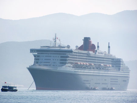 Do kích thước quá lớn, tàu Queen Mary 2 không thể cập cầu cảng mà thả neo trên vịnh Nha Trang. Du khách lên bờ thăm Nha Trang phải trung chuyển bằng hàng chục tender (tàu nhỏ) của tàu.