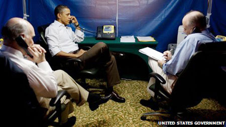Nhà Trắng vừa công bố một bức ảnh hiếm có cho thấy Tổng thống Obama đang điện đàm từ một lái trại ở Brazil nhằm cập nhật tình hình Libya.