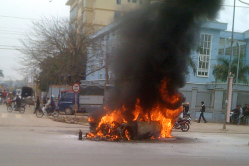 Những người dân sống bên đường xúm lại dùng bình chữa cháy xịt, nhưng càng xịt lửa càng bốc lên. Do sợ bị nổ bình xăng, mọi người không dám cứu cháy nữa.