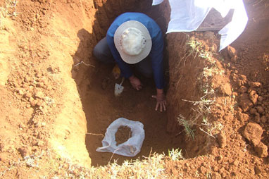 | | Nhiều người dân đến xem khai quật nghĩa địa ngầm |  | | Nhân viên đang tiến hành khai quật mộ. |  | | Nhiều ngôi mộ còn hài cốt của người quá cố. |  | | Hài cốt được các nhân viên đưa vào tiểu sành để đưa đi chôn cất. |  | | Chuẩn bị vàng mã để đưa hài cốt vào tiểu sành. |  | | Gia đình ông Thuận đưa hài cốt của cha mẹ về nơi an táng. |  | | Các tiểu sành được đánh số trước khi đưa đi chôn cất |