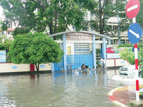 Cổng trường, sân trường THPT Trần Phú (Q.Tân Phú) mênh mông nước vào trưa hôm qua - Ảnh: Mỹ Quyên |