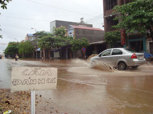 Mỗi khi bị ngập úng, ít nhất cũng phải mất hàng chục ngày, nước trên lòng đường mới tự... bay hơi được hết. Quá sốt ruột chờ ngành chức năng đến giải quyết, một số người dân đã bực tức treo tấm biển “cấm đánh bắt cá”… ở trên lòng đường.
