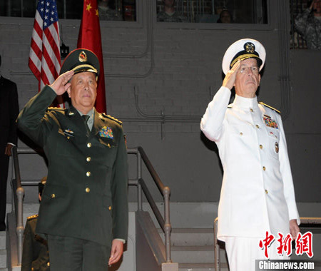 Tổng tham mưu trưởng quân đội Trung Quốc Trần Bỉnh Đức (phải) và người đồng cấp Mỹ Mike Mullen trong buổi hội đàm quân sự cấp cao song phương ngày 17/5.