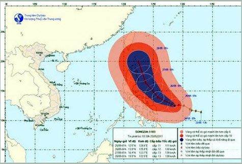Trung tâm Dự báo khí tượng thủy văn Trung ương vừa cho biết, hồi 1 giờ ngày sáng nay, 25/5, vị trí tâm bão ở vào khoảng 12,5 độ Vĩ Bắc; 128,6 độ Kinh Đông, trên khu vực phía Đông miền Trung của Philippin. Sức gió mạnh nhất ở vùng gần bão mạnh cấp 11, cấp 12 (tức là từ 103 đến 133 km một giờ), giật cấp 14, cấp 15.
