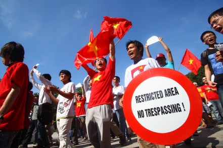 Vào hôm Chủ nhật vừa qua tại Hà Nội, hàng trăm người đã tập hợp để phản đối Trung Quốc gây hấn ở Biển Hoa Nam [Biển Đông]. Hôm 26 tháng 5, một tàu tuần tra của Trung Quốc được cho là đã cắt đứt cáp thăm dò của một chiếc tàu thăm dò dầu khí của Việt Nam khi nó đang tiến hành công việc nghiên cứu địa chấn trong phạm vi vùng đặc quyền kinh tế của Việt Nam. Ngoài ra Việt Nam còn tuyên bố rằng tàu của Trung Quốc hôm 1 tháng 6 đã nã đạn cảnh cáo vào ngư dân Việt Nam đang đánh bắt cá ở vùng biển thuộc chủ quyền của Việt Nam. Biểu tình cũng diễn ra tại Thành Phố Hồ Chí Minh vào hôm Chủ Nhật tuần qua và báo chí Việt Nam do nhà nước quản lý chỉ đến lúc ấy mới vội vội vàng vàng công khai chỉ trích cách hành xử kiểu côn đồ của Bắc Kinh.