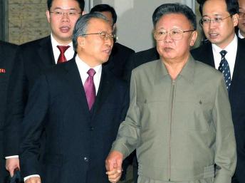 Lãnh đạo Bắc Triều Tiên Kim Jong-il (phải) và Ủy viên Quốc vụ Trung Quốc Đới Bỉnh Quốc, tại Bình Nhưỡng. Reuters / KCNA