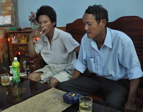 Anh Trần Liệu (áo trắng, bên trái) người đi cùng anh Đường kể lại chuyện trúng kỳ nam. (ảnh KN)