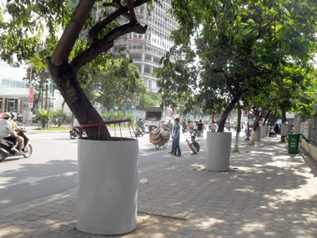 Hai ngày nay, đi trên đường Xuân Thuỷ (Cầu Giấy) người dân ngạc nhiên với hàng loạt gốc cây được rào bằng khung sắt, cao từ 1,5 đến 2m. Bên ngoài khung thép được hàn thêm chiếc áo giáp bằng tôn cứng quây kín mít gốc cây.
