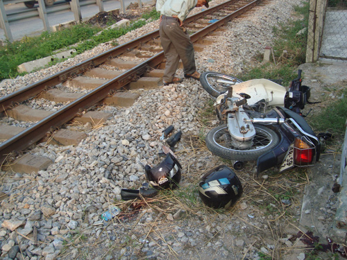 Thấy tàu sắp đến nhưng chiếc xe máy vẫn cố vượt qua đường ray dẫn đến cú va chạm với đầu tàu làm hai mẹ con bị hất văng và chết ngay tại chỗ.