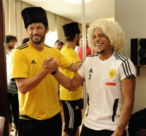 | Roberto Carlos đã giúp thế giới biết đến mảnh đất này nhiều hơn thông qua bóng đá (trong ảnh: cầu thủ Brazil cùng các đồng đội đang mặc bộ áo lông thú truyền thống của người Caucasus) |