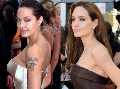 Trước đây, khi Billy Bob Thornton là chồng Angelina Jolie, chỗ đó từng là hình xăm dòng chữ "Billy Bob". Hiện giờ thì nó đã bị thay thế bởi những dòng tọa độ - nơi sinh 6 người con (cả con ruột lẫn con nuôi) của nữ diễn viên.