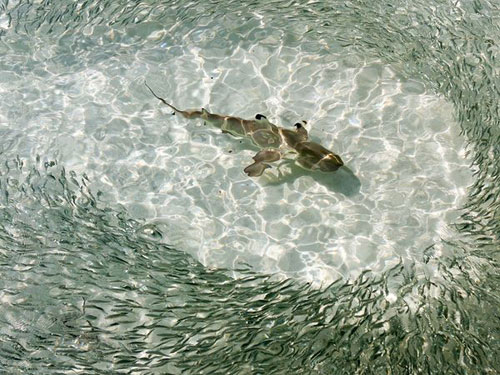 Con cá mập bơi giữa bầy cá nhỏ ở vùng biển Maldives. (Ảnh: Paul Wilkinson)