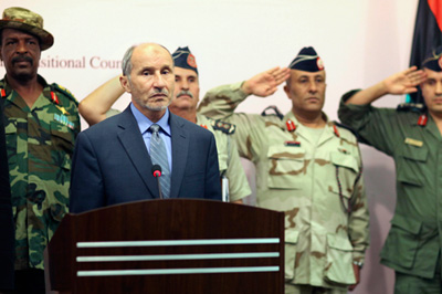 | Chủ tịch Hội Ðồng Chuyển Tiếp Quốc Gia Mustafa Abdul-Jalil trong cuộc họp báo ở Benghazi hôm Thứ Ba liên quan đến việc giải tán ủy ban điều hành. (Hình: AP Photo/Alexandre Meneghini)