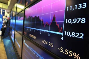 Bàng điện tử cho thấy một đồ thị giao dịch trong ngày và chỉ số Dow Jones ngay sau tiếng chuông đóng cửa tại Sàn Giao dịch Chứng khoán New York hôm 08/8/2011.