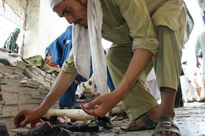 Dân làng Pakistan thu lượm bi sắt sau vụ nổ bom tự sát trong đền thờ Hồi Giáo ở Ghundi hôm Thứ Sáu. (Hình: AP Photo/Qazi Rauf)