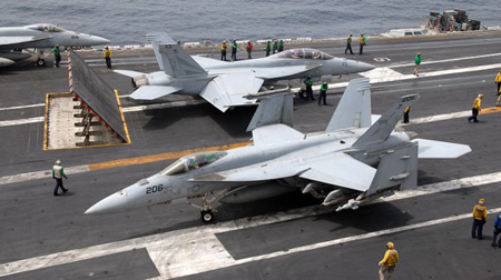 Boong tàu sân bay luôn là một điểm nóng chật hẹp. Trong khoảng sân rộng 1,8 ha, hàm trăm con người cùng 60 chiến đấu cơ luôn túc trực. Trong khi những điều phối viên không lưu vẫy cờ hướng dẫn phi công hạ cánh th́ đội bảo tŕ tất bật sửa chữa các máy bay đang đậu ngay sát mép boong tàu.
