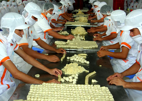 | Từ da bánh cán mỏng cùng với nhân đậu xanh, hàng trăm công nhân bắt tay vào công đoạn gói bánh. |