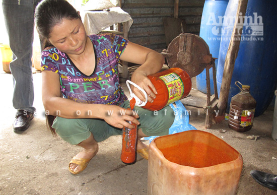 Bùi Thị Chung tự tay chiết xuất tương ớt từ can ra chai, mỗi chai này có giá 3.000 đồng.