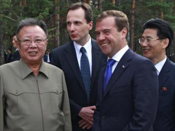 Tổng thống Dmitry Medvedev gặp lănh đạo Kim Jong-il (trái) tại căn cứ "Sosnovyi Bor" ở vùng Buryatia Siberi, 24/08/2011/REUTERS/Dmitry Astakhov/RIA Novosti/Kremlin