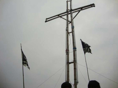 Giáo dân Đồng Chiêm dựng một Thánh giá bằng tre để thay thế Thánh giá bị nhà cầm quyền triệt hạ. (H́nh: Vietcatholic.net)