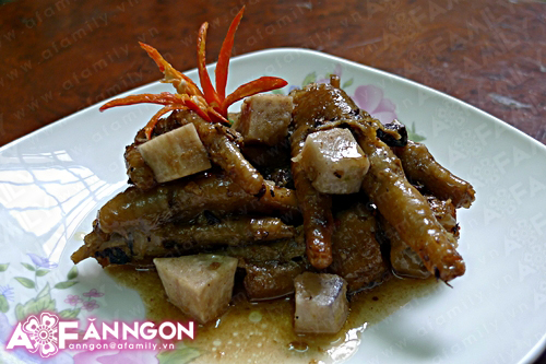 Lót khoai môn dưới đĩa, để chân gà lên phía trên, cho vào nồi hấp và hấp khoảng 20 phút, đến lúc khoai môn chín mềm dẻo thì bạn tắt bếp, lấy đĩa chân gà và khoai môn ra trộn đều là xong.