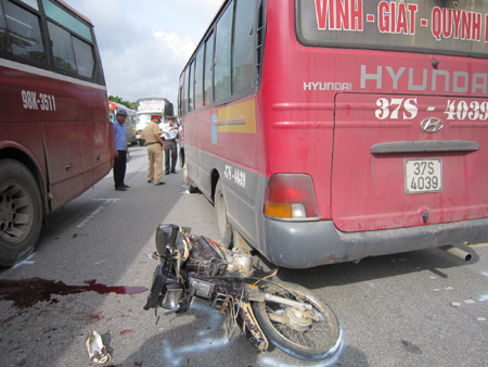 Theo những người dân có mặt tại chỗ chứng kiến vụ tai nạn cho biết: vào thời điểm trên, người đàn ông khoảng 35 tuổi (chưa rõ danh tính) điều khiển xe máy BKS 37P9 1470 đang chở sau người một phụ nữ khoảng 30 tuổi (chưa rõ danh tính) lưu thông tại km 403 + 900 theo hướng Hà Nội - Vinh thì bất ngờ vượt lên trước ô tô khách đi cùng chiều BKS 98 K 3511, vừa lúc đó một ô tô khách khác BKS 37S 4039 đi tới khiến chiếc xe máy bị ép vào giữa hai xe. Người phụ nữ ngồi sau đã chết tại chỗ sau khi bị chiếc xe BKS 37S 4039 cán ngang người. Còn người đàn ông cầm lái bị thương nặng, xe máy cuốn vào ô tô.