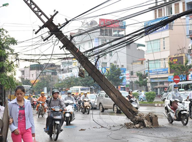 Cột điện bật “gốc” nằm trên đường Hồ Tùng Mậu, Cầu Giấy, Hà Nội. Do phần gốc bị vỡ nát nên khiến thân cột bị đổ, kéo theo hàng loạt dây điện và dây cáp viễn thông xòa xuống mặt đường, chắn lối đi lại.