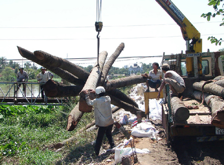 Sử dụng gần 100 thân cây dừa để gia cố đoạn đê bị vỡ. Ảnh: Dương Chí Tưởng - TTXVN