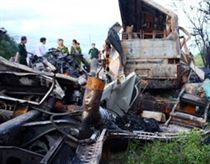 Sau cú tông trực diện, chiếc xe khách cháy rụi khiến 10 nạn nhân thiệt mạng và 20 người bị thương. Ảnh: