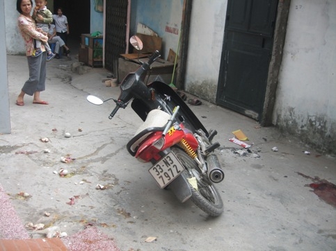 Trước cửa số nhà 28, cảnh tượng kinh hoàng diễn ra. Một người đàn ông nằm sõng soài bên chiếc xe máy, máu me đầy người và tạo thành vũng dưới đường. Chiếc xe máy bị đổ nghiêng, và xung quanh có nhiều trứng vịt lộn bị vỡ. Người dân nhận ngay ra bị hại chính là anh Hùng, thường đi giao trứng vịt lộn quanh khu vực này.