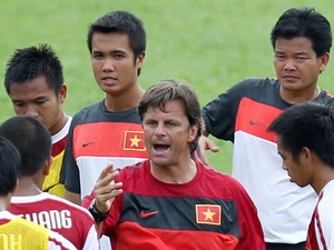 | HLV trưởng Falko Goezt chỉ đạo các cầu thủ. (Ảnh: Quốc Khánh/TTXVN) |