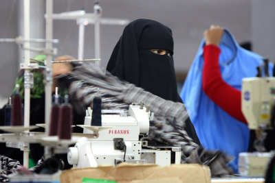 Một phụ nữ Hồi Giáo làm việc tại xưởng may do Trung Quốc làm chủ ở Port Said, Ai Cập. Giá nhân công rẻ tại Phi Châu thu hút nhiều nhà đầu tư Trung Quốc đến lục địa này. (H́nh: Khaled Desouki/AFP/Getty Images)