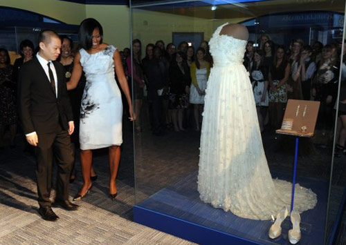 | Buổi triển lãm mang tên 'các Đệ nhất phu nhân'. Trong ảnh là chiếc váy của phu nhân Michelle Obama do Jason Wu thiết kế. |