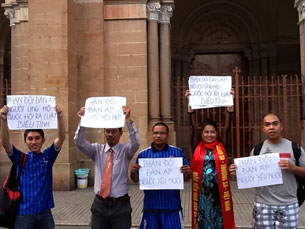 Chị Bùi Thị Minh Hằng tại khu vực Nhà Thờ Đức Bà, Sài G̣n với biểu ngữ cầm tay phản đối việc bắt giữ người biểu t́nh ủng hộ luật biểu t́nh và đeo khăn quàng Hoàng Sa- Trường Sa của Việt Nam ngày 27/11/2011./Photo courtesy of chuacuuthe.com