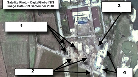 H́nh ảnh xây dựng cơ sở hạt nhân tại Yongbyon, chụp từ vệ tinh ngày 29/9/2010. Nguồn: Strategic-discourse. 1. Xây dựng và thiết bị đào hạng nặng/ 2. Các dấu vết của cơ khí hạng nặng/ 3. Khu vực tháp làm mát bị phá hủy/ 4. Các ṭa nhà mới xây