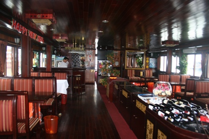 Nội thất một chiếc tàu du lịch trên Vịnh Hạ Long được cho là khá hài hòa với vỏ tàu màu nâu.