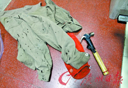Bộ ần áo còn vương vết máu và chiếc búa chuyên gây án của Lý Mỗ Hoa.