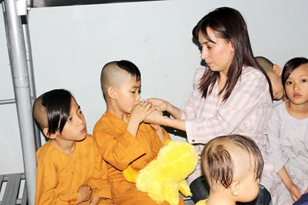 Ca sĩ Phi Nhung đang chăm sóc những đứa trẻ ở chùa Pháp Lạc.