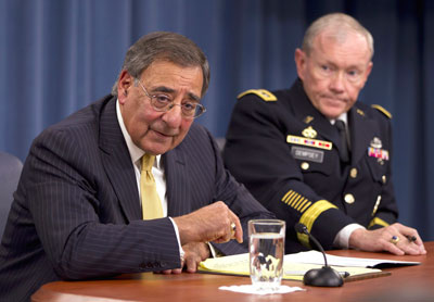 Bộ Trưởng Quốc Phòng Leon Panetta và Tham Mưu Trưởng Liên Quân Martin Dempsey trong cuộc họp báo tại Ngũ Giác Ðài hồi năm ngoái, nói về ngân sách quốc phòng. (Hình: AP/Evan Vucci)