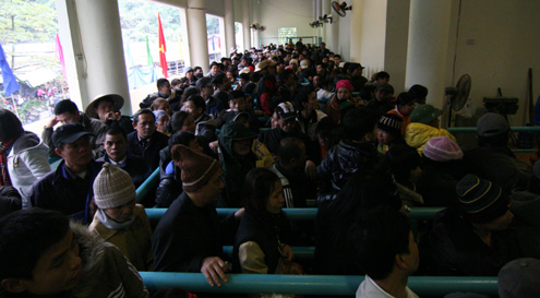 Trong ngày đầu khai hội chùa Hương, hàng nghìn khách đã phải xếp hàng chờ hàng tiếng đồng hồ mới mua được vé cáp treo. Tuy nhiên, du khách có thể đi con đường nhanh hơn nếu... chịu chi tiền nhiều hơn.