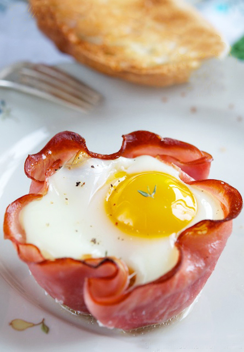 - Với mỗi khuôn nướng cupcake, bạn đặt vào 2 lát thịt hun khói và nhớ dàn thịt sao cho phủ kín khuôn nha!