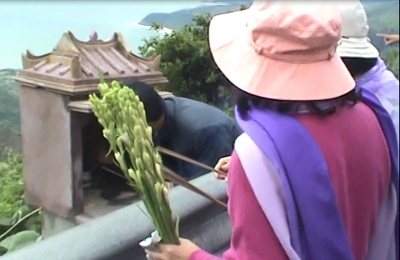 Thân quyến của Tướng Ngô Quang Trưởng khấn vái trên ngọn đèo Hải Vân trước khi rải tro của ông. (Hình: Người Việt, từ video do bà quả phụ Ngô Quang Trưởng cung cấp)