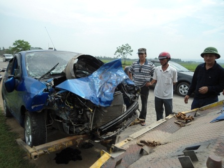 Đang chạy với tốc độ nhanh, chiếc "xế hộp" màu xanh đột nhiên mất lái đâm thẳng vào đầu một chiếc xe tải chạy ngược chiều. Hậu quả vụ tai nạn đã làm 5 người trên xế hộp bị thương phải nhập viện.