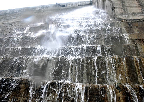 | Hai bên cửa xả thân đập chính xuất hiện 2 vết nứt lớn, nước tạo dòng chảy xối xả từ trên cao xuống. |