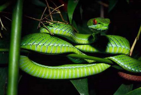 Rắn lục mắt hồng ngọc gây ấn tượng mạnh mẽ với đôi mắt đỏ long lanh như hồng ngọc nổi bật trên lớp vẩy màu là cây xanh biếc. Ảnh: National Geographic.